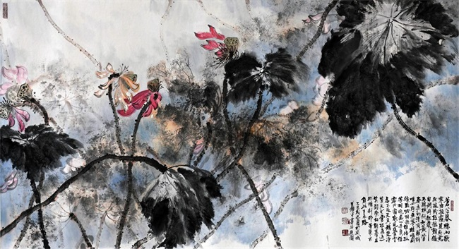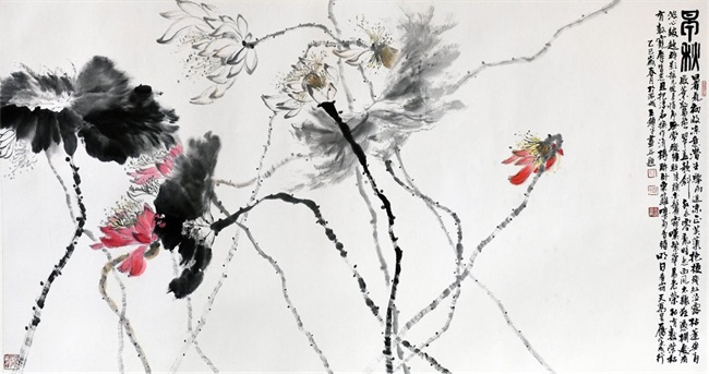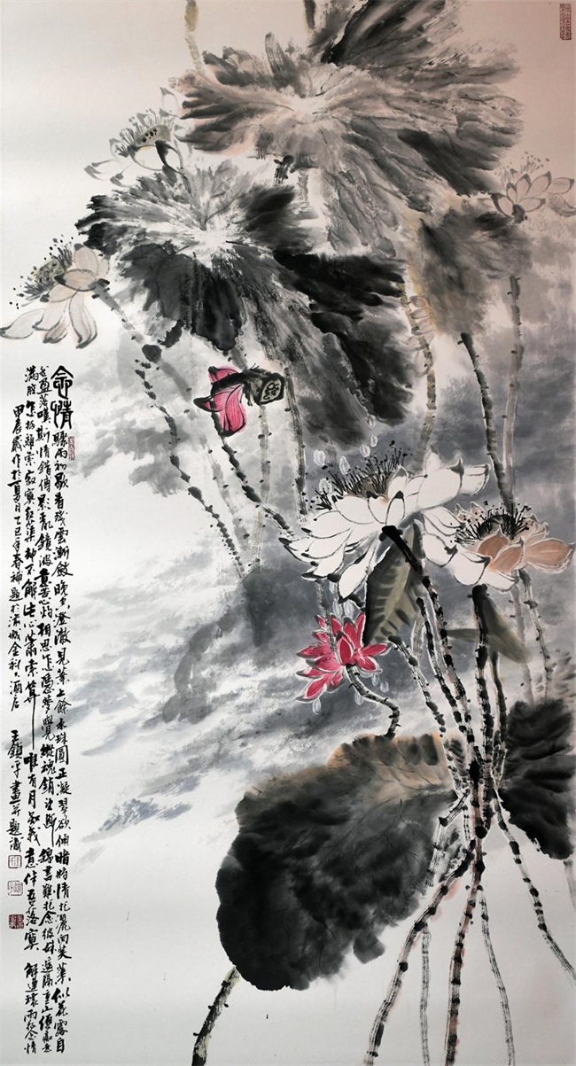 在创作荷花时,王锁平怀着对美好生活的赞美和对祖国繁荣昌盛的祝福。他以荷花为主体,荷花在中国文化中象征着纯洁、高尚和和平。例如《盛世图》这幅作品,以荷花绘就繁荣之景。笔墨上,兼工带写,荷花细腻,花瓣纹理、花蕊形态毕现,色彩娇艳不失雅致;荷叶豪放写意,浓墨晕化,层次质感丰富。构图饱满有张力,荷花错落分布,达成动态平衡,荷叶枝干增添空间纵深,留白予人遐想。不仅展现了他高超的绘画技艺,更传达出他对时代的赞美和对未来的憧憬。