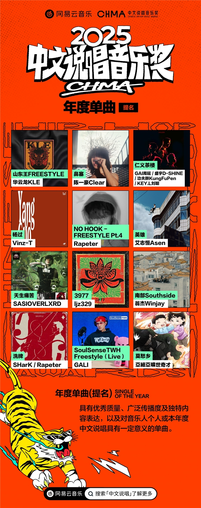 1月9日,网易云音乐2025中文说唱音乐奖提名名单正式发布。艾志恒Asen、陈一豪Clear、GAI周延、GALI、华云龙KLE、SHarK、泰格西、Vansdaddy、王齐铭、谢帝、张方钊等众多音乐人收获年度荣誉提名;陈娴静、Rapeter、Top Barry、翁杰Winjay等入围年度瞩目新星。获奖名单将于1月下旬正式揭晓。此外,所有入围作品已同步入选大众选择奖候选名单,乐迷可在网易云音乐APP搜索“中文说唱”,参与投票选出大众选择单曲及大众选择专辑。