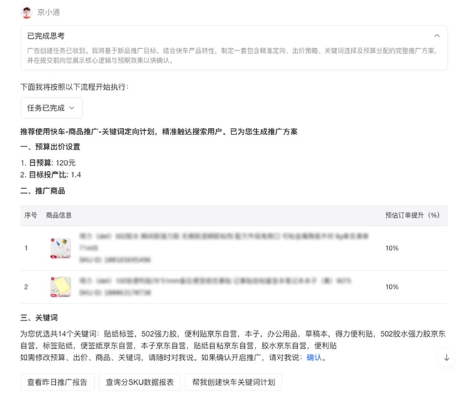 目前“京小通”已经具备了全面而成熟的服务能力,不仅能够依据商品卖点,秒级生成高质量的广告创意与视觉素材,还能融合分析跨账号、跨产品的经营数据,并自动完成归因分析;同时,商家通过对话即可完成自动化批量操作,显著提升广告投放人效。“京小通”内置的、经过京东生态验证的专家级知识库,更能7×24小时为商家实时答疑解惑,提供诊断优化建议。