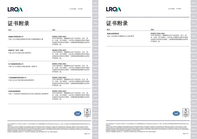 ISO/IEC 27001:2022是信息安全管理体系的规范标准,是目前国际上最权威、最严格,也是被广泛接受和应用的信息安全领域的体系认证标准。而ISO/IEC 27701:2019作为其重要扩展,明确了隐私控制要求,可有效降低个人隐私权面临的风险。两项认证的获得,标志着泰康医疗已构建覆盖信息安全与隐私保护双重维度的完整管理体系,不仅在技术防护和管理机制上达到国际权威标准,更在患者健康医疗数据的全生命周期保护方面实现了与全球最佳实践的接轨。