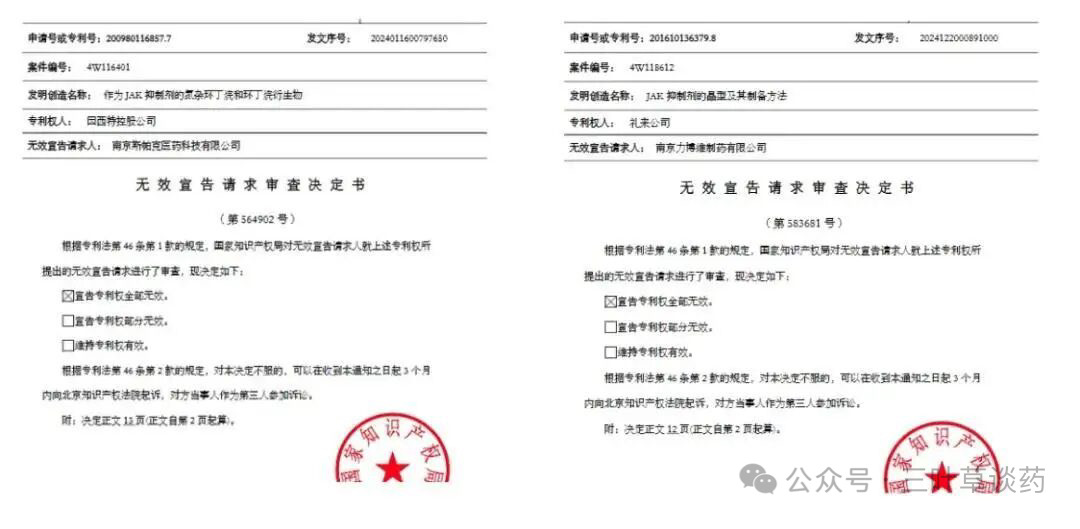 在国内市场,巴瑞替尼于2019年7月获批上市,并纳入2020版国家医保目录,适应症涵盖类风湿性关节炎与斑秃,同样展现出良好的市场前景。摩熵医药数据显示,巴瑞替尼当前院内总销量达8.29亿元,2023年销售额3.29亿元,同比暴增114.35%,2024年为2.52亿元。值得一提的是,巴瑞替尼核心中国化合物专利(CN200980116857.7)原应2029年3月10日到期,2024年1月29日被国知局宣告全部无效,请求人为南京斯帕克医药;其晶型专利(ZL201610136379.8)亦被国知局宣告全部无效,请求人为南京力博维制药。