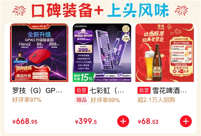 除了以上组合式购买的键啤CP外,本次活动还推出了超多限时折扣活动,罗技、七彩虹、雪花啤酒等经典爆品价格直降。七彩虹青羽98 Ultra磁轴键盘限时补贴15%,到手价仅399.5元;口感醇厚的经典老雪花享受满赠等好礼。此外,活动期间会场还设置了多轮抽奖环节,福利不容错过,也许下个好运锦鲤就是你。