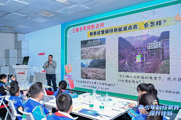 这些源于家乡真实场景的提问,配合着同学们用心制作的场景展示板,让这些带着地域特色与生活温度的问题,既生动又形象。隆基绿能可持续发展专家汪子阜现场对同学们的问题给予回答。光伏+水电的互补方案,为老旧水电站注入新活力;光伏大棚、屋顶光伏系统,精准回应了乡村与城市的绿色需求……同学们将写有“让大棚用上太阳能”“家乡山坡布满光伏板”“让学校拥有光伏雨棚”等绿色心愿的叶片贴纸,共同贴在“绿色能源之树”背景板上,以童心共绘未来绿色图景。