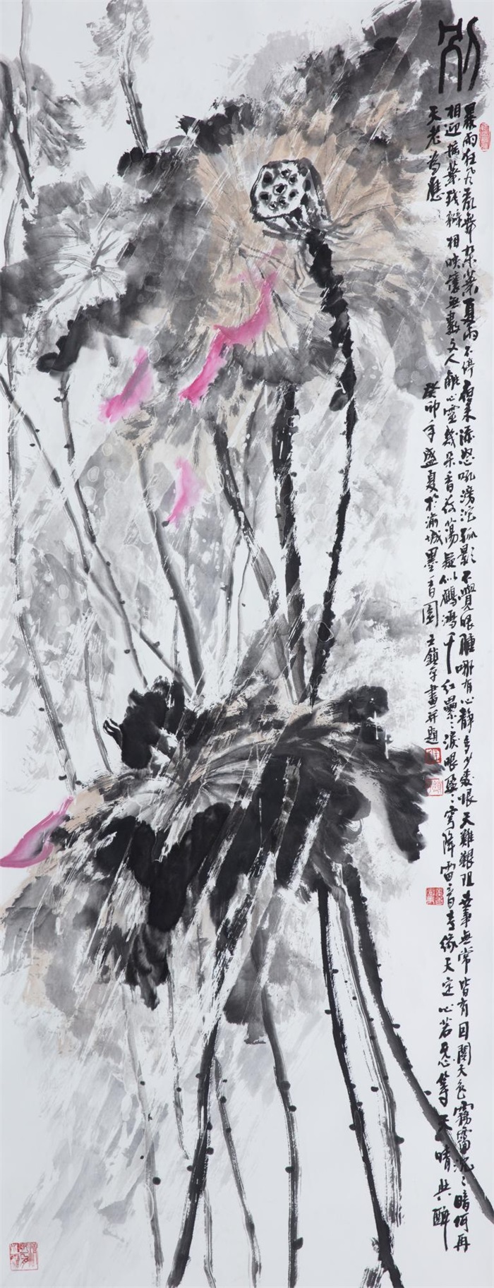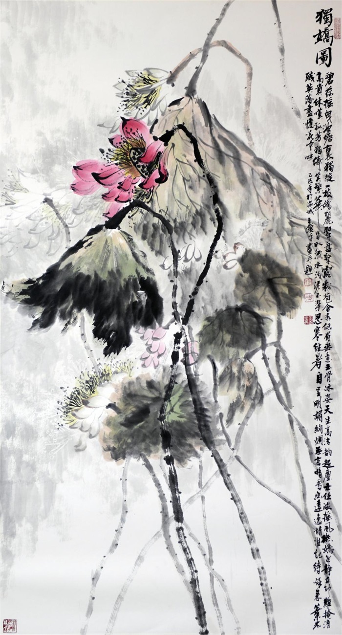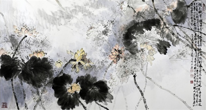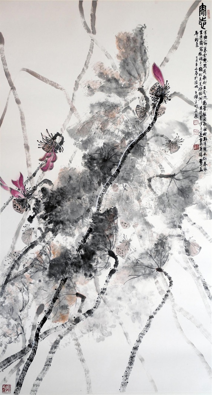 王锁平在诗歌、书法、绘画方面都有着较高的造诣,可谓是才华横溢,触类旁通。他的书画作品很多都被国家顶级的艺术机构所收藏,比如国家博物馆、比如人民大会堂、比如中国美术馆,这些都是很多书画家极为仰慕的艺术殿堂。他擅长泼墨写意的山水和花鸟,他的用笔可谓是皴擦点染,泼墨大胆,浓淡干湿,变化万千。比如他的山水:气韵生动,妙趣横生;他的荷花可以说是融汇了古代的石涛、八大、徐渭、张大千等等经典画家的笔墨和意趣。所以他的画面给人一种夸张变形的形式效果,摆脱了那种自然再现的束缚,凸显出荷花的精神气象。无论是含苞待放还是盛开绽放,都能给人一种天真烂漫,绚丽多姿的勃勃生机。完美的诠释出了“丹青难写是精神”的意境。