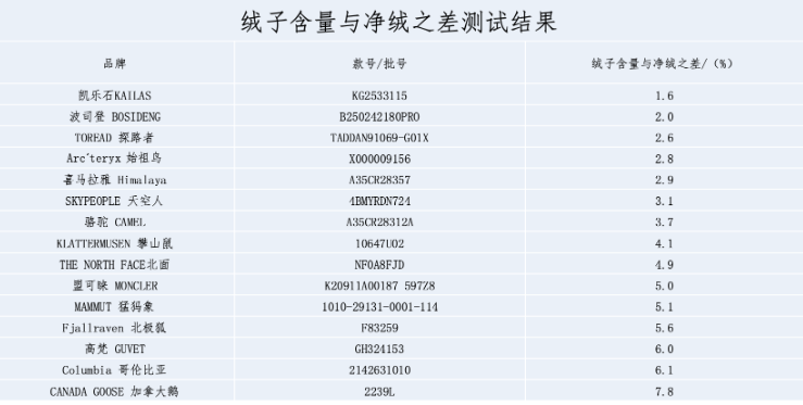 图片来源:羽绒服装比较试验报告【绒子含量与净绒之差测试结果】