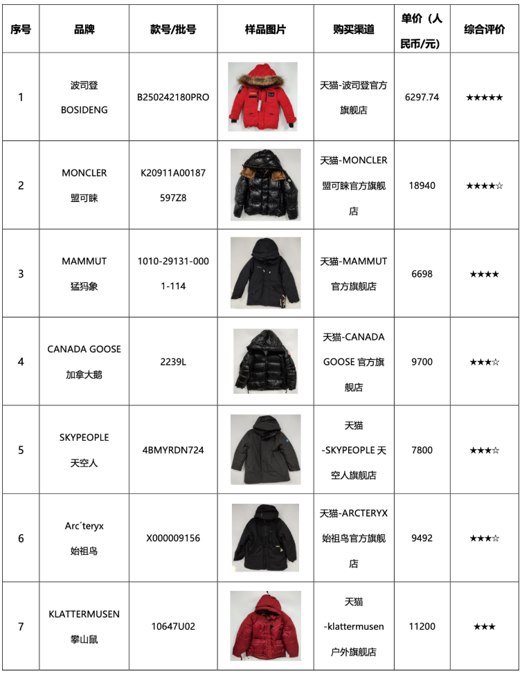 图片来源:羽绒服装比较试验报告【15款羽绒服样品信息及比较试验结果一览表】