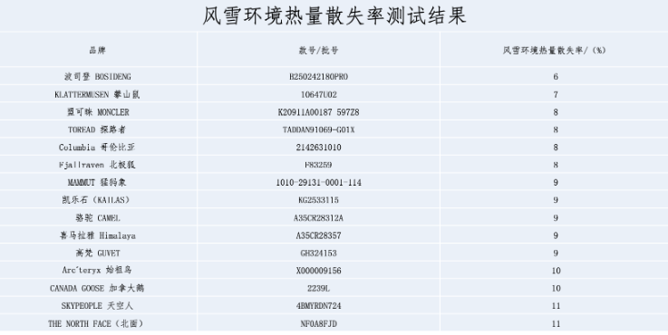 图片来源:羽绒服装比较试验报告【风雪环境热量散失率测试结果】