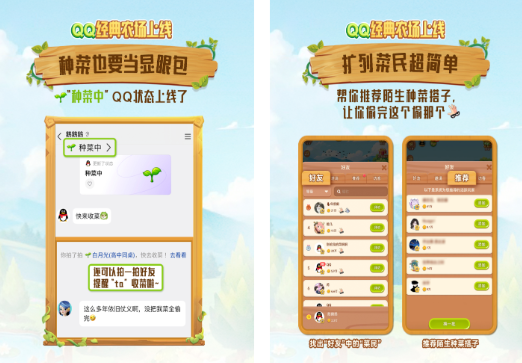 社交属性的强化,是此次回归的另一大亮点。通过融合“拍一拍”、聊天状态同步、扩列好友等当下QQ用户喜爱的玩法,打造更具沉浸感的好友互动体验。具体而言,偷取好友作物后,可触发QQ“拍一拍”提醒,通知被偷菜的好友第一时间上线“复仇”,互动趣味翻倍;新增“种菜中”标识,可直接展示在聊天窗口与个人资料卡,让好友一眼洞悉你的农场动态,做列表里的“种菜显眼包”;更有“可能认识的农场玩家”精准推荐,一键添加QQ好友中的同款菜友,从此偷菜、互助不孤单,轻松扩列专属农场社交圈。