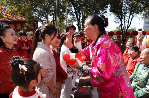 第三篇章“文化传承·互动共生”聚焦孝道文化的当代传播。孝亲故事分享环节,孝亲模范讲述自身践行孝道的真实经历,志愿者生动演绎三公主“红线助民、体恤苍生”的传说,让现场参与者深刻感受孝道的温暖与力量。非遗孝亲体验区里,香囊手作、孝亲寄语、孝道问答等互动活动精彩纷呈,参与者亲手制作祈福香囊赠予长辈,在寄语墙上写下对长辈的美好祝福,除香囊手作、孝亲寄语、孝道问答外,特别融入非遗米龙孝文化展示与体验,参与者可近距离观赏非遗米龙作品,感受传统非遗与孝道文化的深度融合;以非遗之礼寄孝亲之情,在趣味互动中深入了解三公主文化、闽地孝道习俗及非遗米龙文化的深厚底蕴,沉浸式感受传统文化的魅力。最后,全体参与者齐声祈福,共祝天下长辈福寿安康。