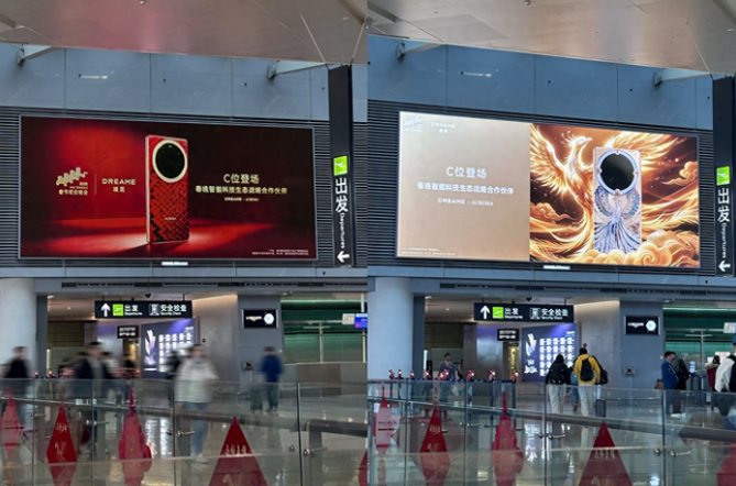 近日,全国各大核心机场迎来一组绯红色与金色为主视觉的广告大屏,画面主角是AURORA手机的两款高奢系列产品,正值春运返程出行高峰期,金色与红色两款广告聚焦于机身背板的材质纹理与镜头模组的结构细节,以强视觉冲击力吸引往来商旅人群的驻足目光。