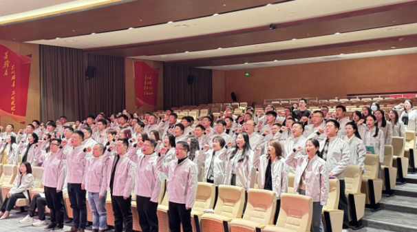 “我志愿加入中国共产党……”在宫书记的带领下,全体党员起立,高举右拳,重温入党誓词。铿锵有力的誓言在会场回荡,唤起了每位党员最初的理想信念和入党初心。