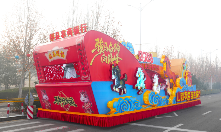 彩车之上马踏祥云、骐骥驰骋,红色巨帆迎风舒展,这是勇立潮头的昂扬姿态,是乘风破浪的坚定信念,更是激昂奋进的时代号角,这抹亮眼的“农商红”, 既寄寓马年乘风破浪、再创佳绩的美好愿景,更向全县人民传递出坚守本土、服务家乡、携手共赴崭新未来的坚定担当。