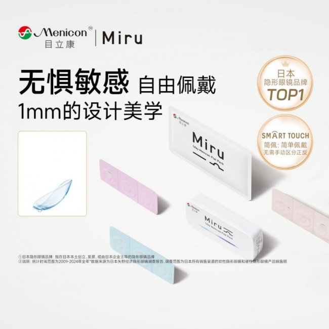 目立康Miru(小纸片)系列,主打敏感眼专属舒适体验,2014年,Menicon旗下Miru跨海而来,以独特超薄便携设计,为中国用户带来舒适佩戴体验。一经推出便获得敏感眼人群广泛认可。敏感眼人群眼部脆弱,对镜片材质、卫生与舒适度要求极高,普通隐形眼镜易引发干涩、异物感、泛红等不适,目立康Miru系列将“温和、舒适、健康”的设计理念融入产品的每一处细节。