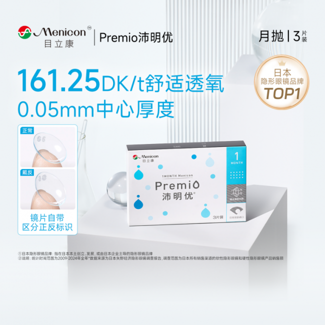 目立康沛明优(Premio)系列,定位高透氧长效舒适,针对上班族、学生等长时间佩戴人群,2025年10月推出月抛版本,2026年日抛版本即将升级回归。