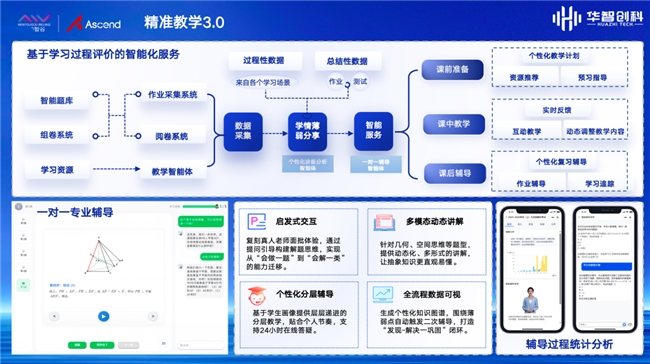 程总还详细介绍了华智创科“精准教学”的落地应用场景,目前该方案已深度应用于考试指导和作业辅导两大核心教学环节。在考试辅导中,通过专属大模型与智能体对试卷进行前置处理,并经过机审+人工审核双重校验,为每位学生生成专属智能体教师,引导学生完成考试复盘,实现知识全面掌握;在作业辅导中,智能体以苏格拉底引导式辅导为核心,不直接给出答案,而是通过多知识点关联、多题型拓展,让学生融会贯通。
