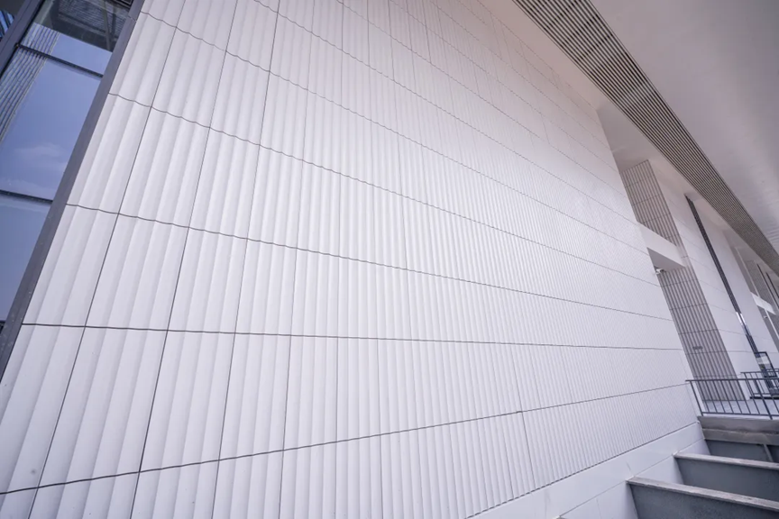 铝复合板金属幕墙广泛应用于墙面、檐口及室外吊顶,面对多角度折边、异形曲面等施工难题,设计团队通过精准深化设计与三维建模,让每一块板材都高精度拟合设计轮廓,尽显建筑挺拔精致的现代气质。