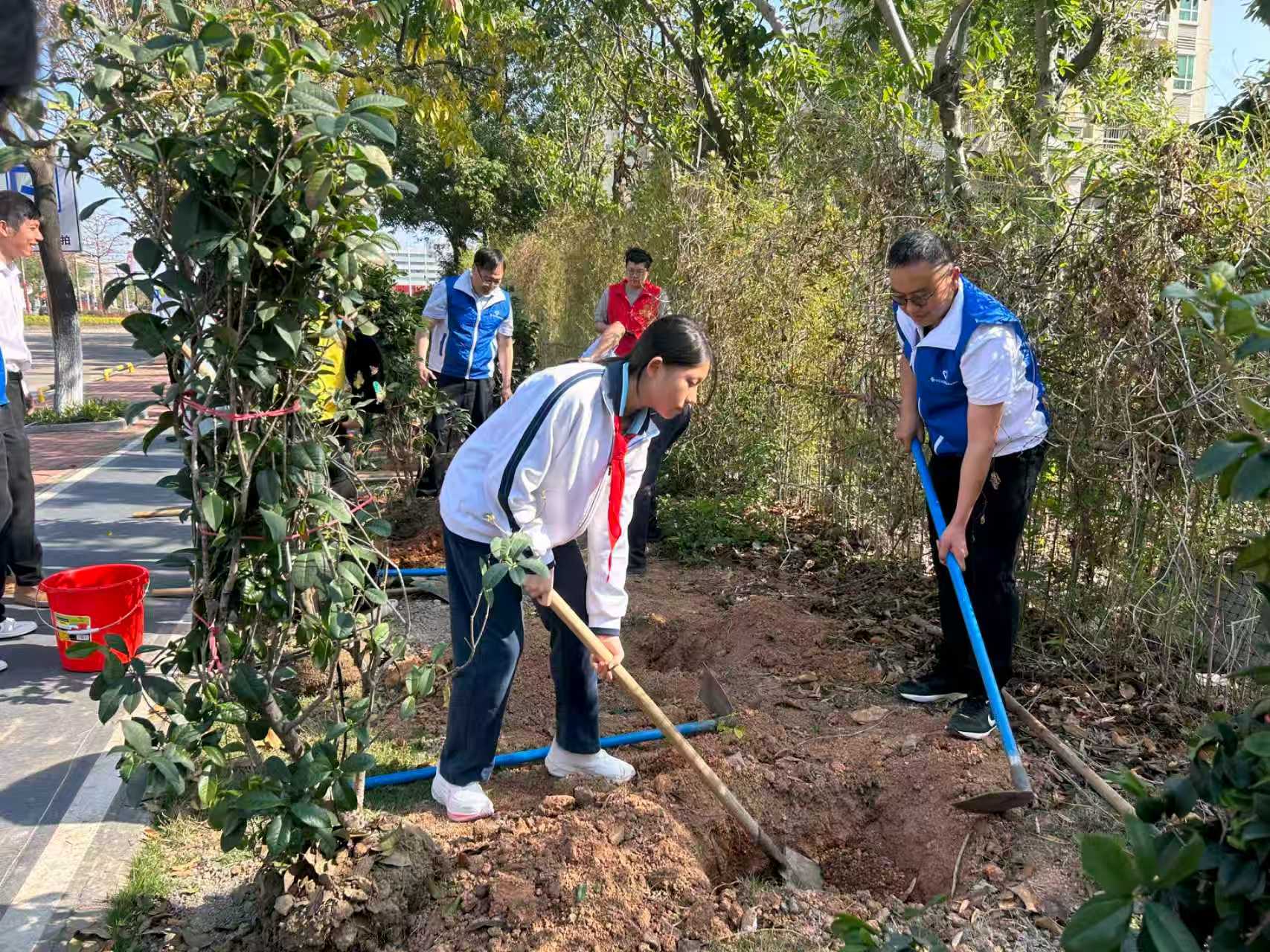 活动现场热火朝天、氛围浓厚。大家积极发扬雷锋同志 “不怕苦、不怕累” 的优良作风,纷纷拿起铁锹、水桶等工具,迅速投入到植树劳动中。大家分工协作、配合默契,挥锹铲土、扶苗填坑、踏土夯基、提桶浇水…… 各个环节衔接有序、有条不紊。尽管汗水浸湿了衣背,但每个人的脸上都洋溢着劳动的喜悦与满满的成就感。