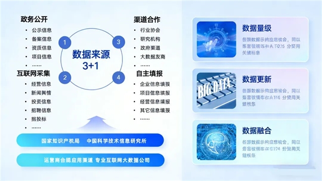 •汇聚政务公开、互联网采集、合作渠道、企业自主填报等“3+1”数据来源,形成全域融合的数据资源池。