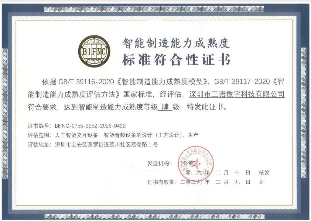 就在不久前,三诺智慧声谷的智造实力,还获得了权威认证加持。成功斩获了智能制造能力成熟度四级(优化级)认证,该认证体系最高为五级,目前国内暂无企业获得,四级为行业当前领先水平。这也充分印证了三诺在非标自动化集成、多品种小批量柔性智造、声学主动降噪测试等环节的扎实功底。