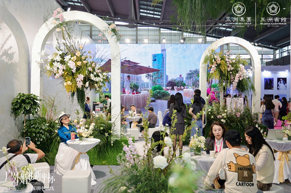 本次婚博会展厅设计灵感,源自五洲宾馆近50000㎡后庭院,酒店独有的花园式园林意境——曲径通幽、移步异景、绿意盎然,被完整复刻于展会现场。整体以白绿交织为主调,花艺、绿植、原木元素错落排布,于方寸之间还原五洲庭院独有的松弛感与雅致格调,让每一对走进展位的新人,提前沉浸式感知在五洲举办婚礼的浪漫与从容。
