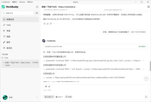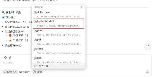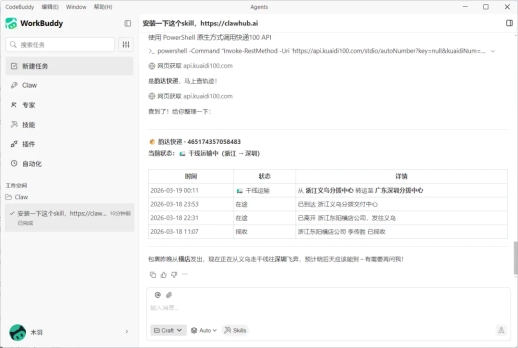 如今,这些复杂环节已全部由快递100深度封装。只需安装一个快递100 Skill,如同为你的智能体直接搭载一套官方级 “快递查询应用”,开箱即用,无需开发即可让 AI Agent 快速具备专业物流服务能力。