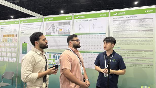 展台上,宝杰科技重点展示的生物质气化+多能耦合一体化解决方案成为亮点。该方案以生物质气化为核心,耦合光伏、风电、热泵、储能、余热回收等技术,实现热、电、炭、氢、冷、暖多形态能源供应与智能调配,精准契合东盟地区打造零碳工厂、零碳园区的发展需求,凭借技术先进性与场景适配性,成为现场咨询交流的热门。