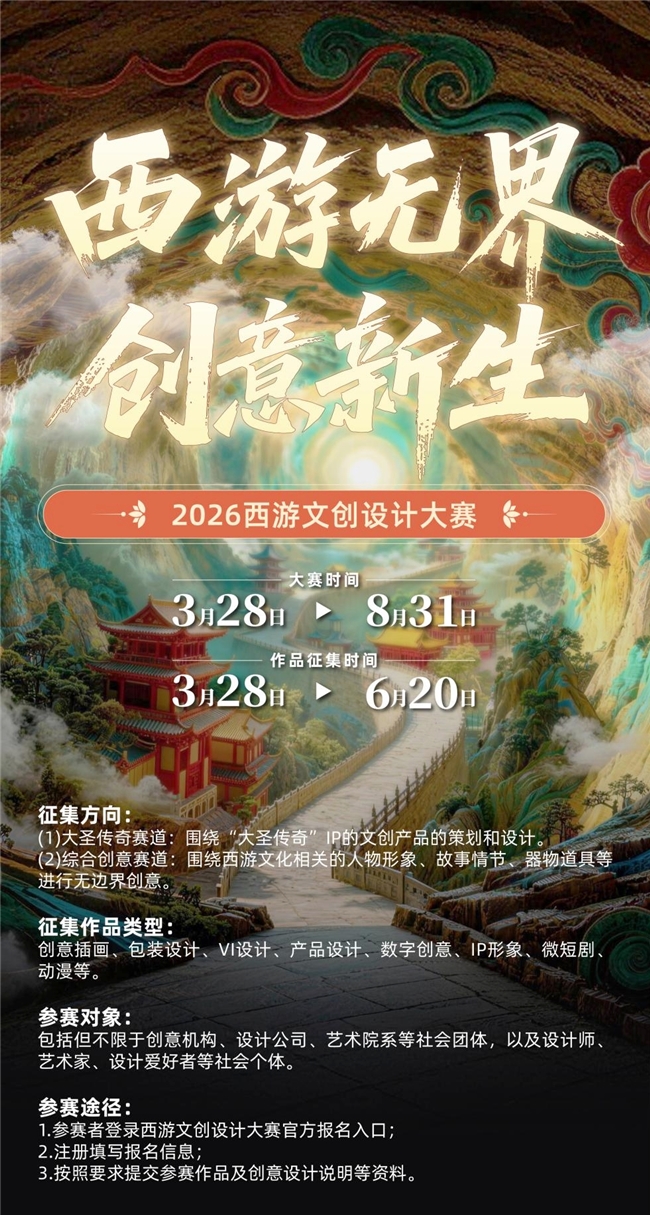 本次大赛征集范围面向全球和全社会,包括但不限于创意设计机构、文化传播公司、高校艺术院系等社会团体,以及专业设计师、艺术家、文创爱好者、在校学生、西游文化爱好者等社会个体。赛事无专业门槛、无年龄限制、无技术壁垒,可个人参赛,也可团队参赛。