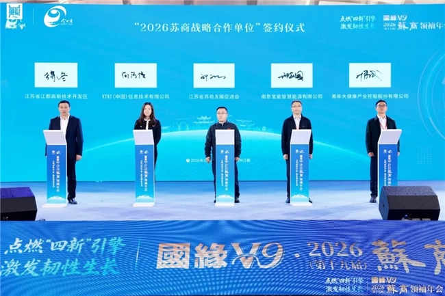 同时,江苏省苏商发展促进会与钉钉(中国)信息技术有限公司、南京宝能智慧能源有限公司、美年大健康产业控股股份有限公司、江苏省江都高新技术开发区等单位,共同签署“2026苏商战略合作单位”协议,多方携手,共同赋能苏商高质量发展。