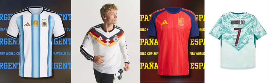 为满足球迷身着特定球衣看球赛的需求,京东精选多款阿迪达斯正版球员版球衣。阿根廷国家队世界杯梅西同款球衣,有三冠星纹与卫冕冠军盾牌印花,后颈1893字样致敬队史经典时刻;西班牙国家队世界杯亚马尔同款球衣,国旗配色鲜明醒目,后颈印有西班牙字样;德国国家队世界杯维尔茨同款球衣,延续经典主场风格,采用轻感针织提花面料,兼具潮流质感与运动性能。此外,彪马葡萄牙队C罗同款球衣同样深得球迷喜爱,白底搭配大面积蓝绿色波浪纹样,面料吸湿排汗,观赛全程能保持干爽。