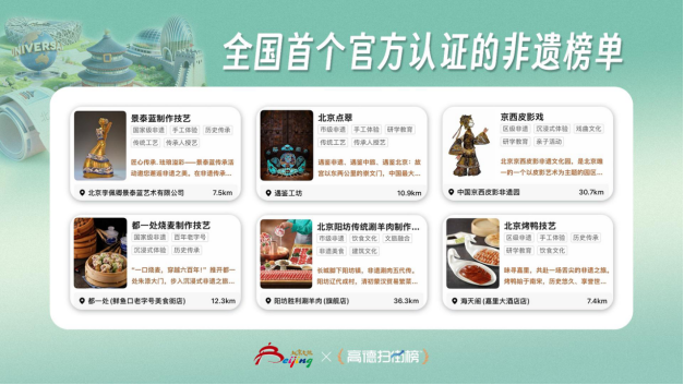 该榜单依托政府部门的权威资源与高德的真实数据,聚焦具有深厚文化底蕴、良好市场口碑的老字号和非遗项目,推动传统文化“活”起来、“火”起来,让游客更好地感受北京非遗魅力,实现非遗品牌的创造性转化、创新性发展。