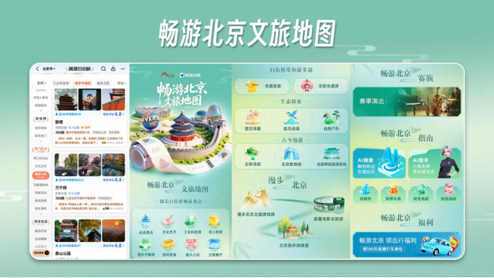 在发布榜单的基础上,北京市文化和旅游局还携手高德发布了“畅游北京”文旅地图,以智能推荐、惠民服务、互动共享为方向,系统集成扫街榜资源、精品游览线路、特色消费场景等内容,并上线AI文旅助手,提供24小时智能咨询、个性化行程规划等服务,推动传统地图从基础查询、导航功能,向可推送、可游览、可消费的全场景智慧服务平台迭代升级。