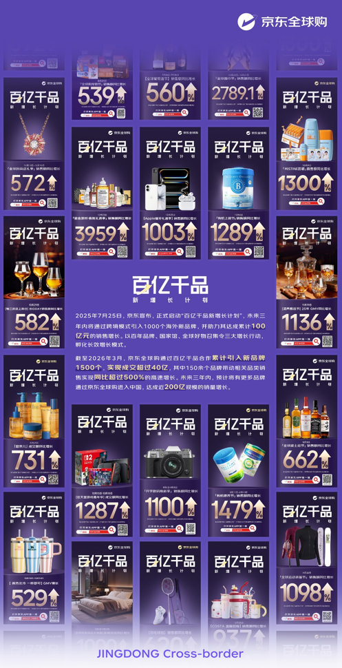 2025年7月,京东全球购推出“百亿千品新增长计划”,提出未来三年内通过跨境模式引入1000个海外新品牌,并助力其达成累计100亿元的销售增长。据介绍,“百亿千品新增长计划”自推出以来,受到了广大海外品牌的热烈欢迎,截至目前仅8个月就已累计引入新品牌1500个,上架新供给超过1.4万个,实现成交超过40亿元,其中150余个品牌带动相关品类销售实现同比超500%高速增长,远超预期;在此基础上,京东全球购提出,未来三年内将助力海外品牌达成近200亿规模的销量增长。
