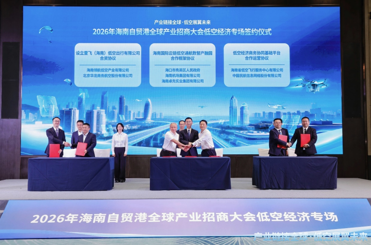 2026年4月14日,第六届中国国际消费品博览会暨第二届海南自由贸易港全球产业招商大会召开。北京华龙商务航空股份有限公司(以下简称“华龙航空集团”)与海南机场旗下海南领航低空产业有限公司正式签署合资协议,共同成立海南低空出行有限公司。