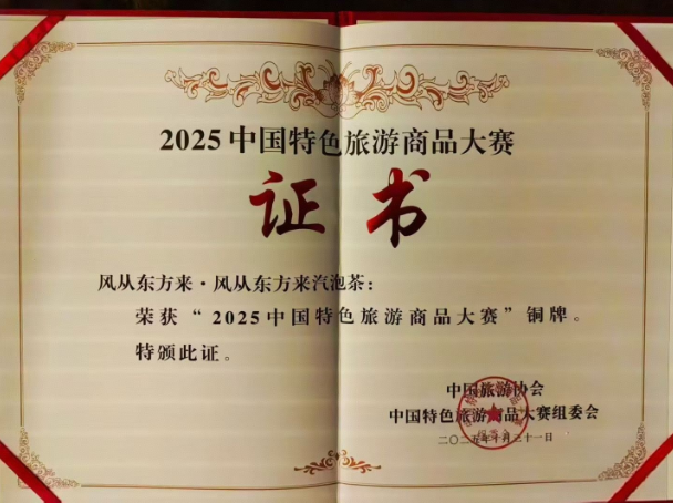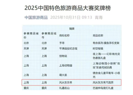 2025年10月31日中国特色旅游商品大赛在青海西宁圆满落幕,上海市文化和旅游局选送以“上海礼物”为代表的98件参赛作品,在全国3万多件参赛商品的激烈角逐中脱颖而出,斩获佳绩,其中风从东方来饮料(上海)有限公司参赛商品《风从东方来汽泡茶》获得2025中国特色旅游商品大赛铜奖。