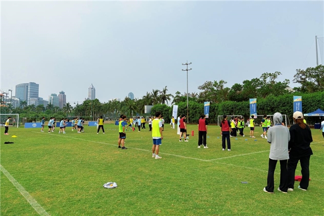 腰旗橄榄球公开赛在海口世纪公园滨海草坪同步举行。赛场上,选手们身手敏捷、战术多变——快速变向、精准传接、瞬间摘旗,每一次攻防转换都扣人心弦。碧海蓝天、绿意草坪与奔跑的身影构成了一幅充满活力的自贸港运动画卷。