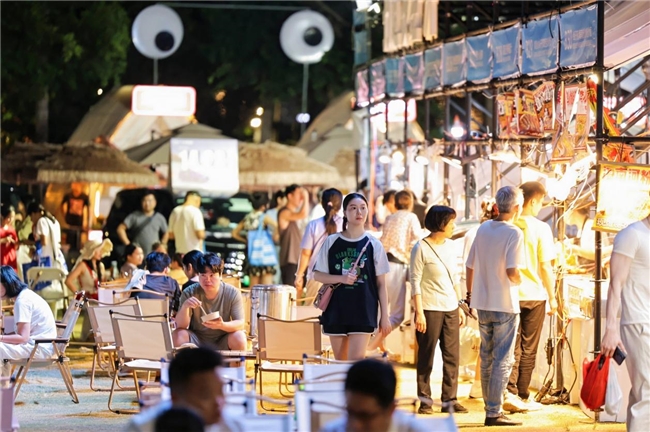 现场休闲体育展区汇聚时尚运动装备与互动体验项目,打造沉浸式运动能量场;主理人好物市集与特色文旅产品展区集中展示文创艺术、海岛好物与地方特色商品,成为新晋潮流打卡地;美食街区汇聚海南特色小吃与各地风味,满足市民游客多元味蕾需求;音乐LIVE舞台上,海口市音乐家协会倾情演绎,用悠扬旋律点亮椰城夜晚。同时,新能源汽车展示同步亮相,实现体育、文旅、商业、科技跨界联动,有效激活城市夜间消费潜力。