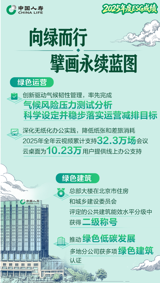当前,ESG不仅是全球企业可持续发展的核心标尺,更是我国推进“双碳”目标、构建多层次社会保障体系,以及防范金融风险的国家战略要求。在金融监管政策持续强化ESG披露、国务院“双碳”行动方案推动绿色金融扩容的背景下,寿险行业头雁——中国人寿保险股份有限公司(以下简称“中国人寿”,股票代码:601628.SH,2628.HK)以ESG为锚,将国家战略融入企业基因,以行业领先的ESG 评级与超7000亿保费规模,彰显金融央企服务中国式现代化的责任担当。