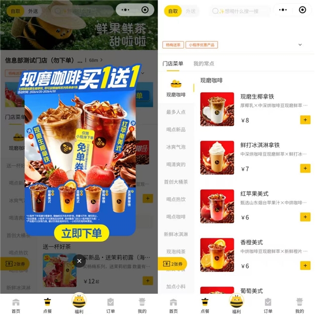 4月20日甜啦啦推出“现磨咖啡,买一送一”活动,消费者通过小程序购买生椰拿铁即赠咖啡免单券。品牌通过数字化监控与物联网体系严控品质,在亲民定价下保障每一杯现磨咖啡口感稳定。