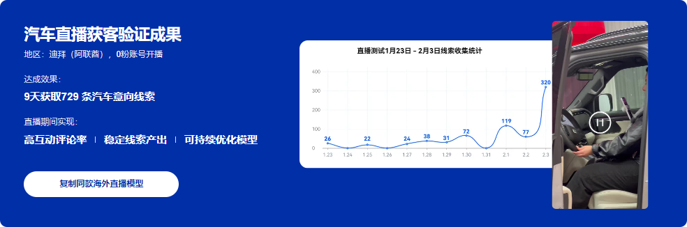 以汽车行业为例,兔克出海在TikTok汽车直播赛道突围,将国内成熟的自然流打法复制至海外,在迪拜的滞销逆境中,通过零粉新账号与新手主播击败了20万粉的本地账号,确立了“母语主播+国内玩法复用”的核心打法。