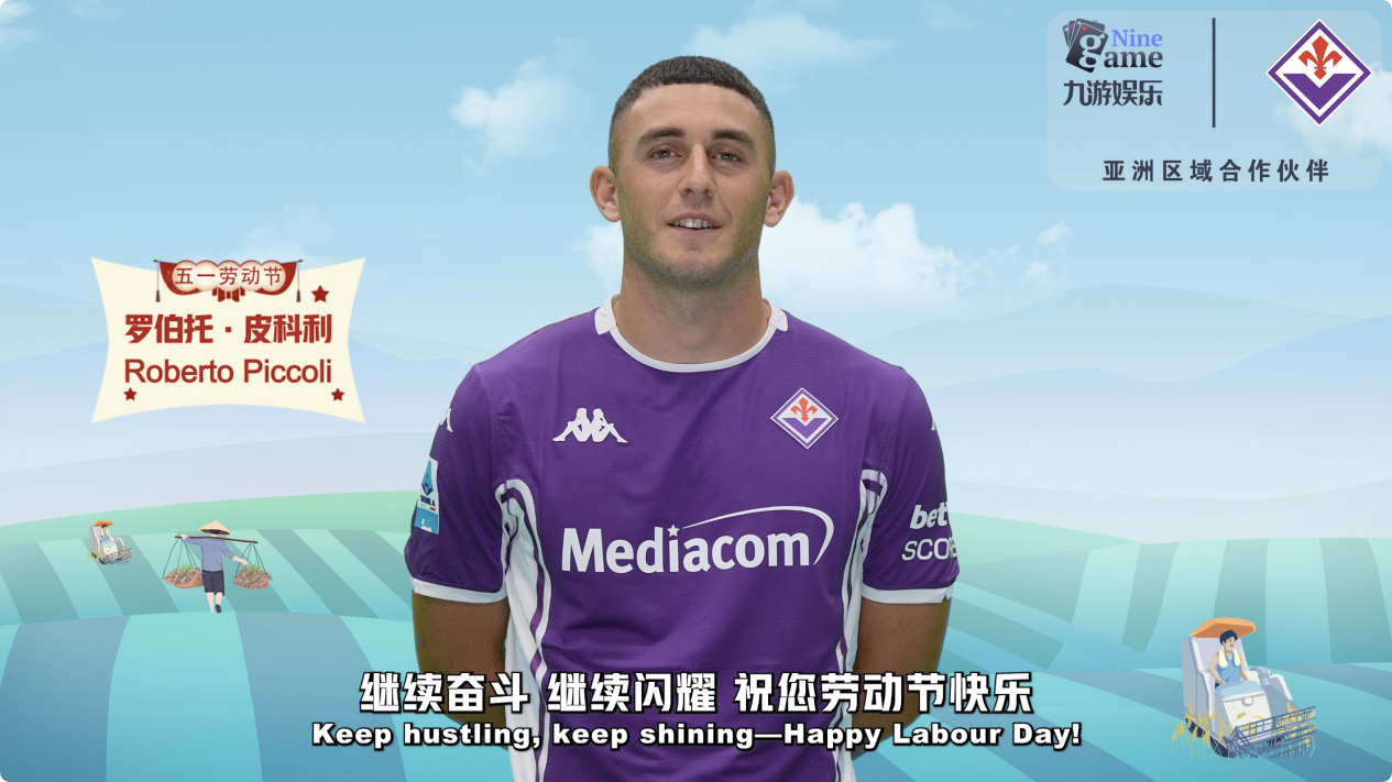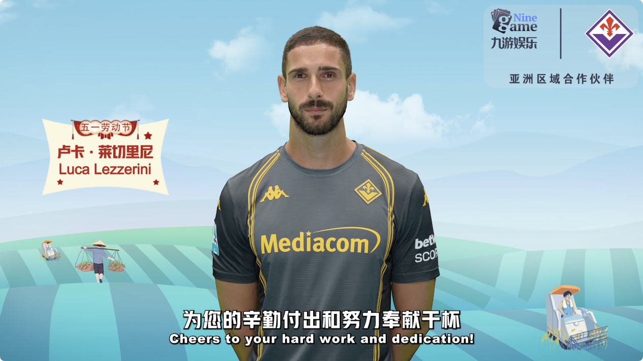 在这段与九游娱乐联合制作的劳动节祝福视频中,佛罗伦萨足球俱乐部多位一线队球员相继出镜传递节日心意。后卫丹尼尔·鲁加尼以亲切语气开场,向劳动者致意:“致敬每一份努力与奉献,为劳动者喝彩”随后,门将卢卡·莱切里尼送上简洁而真挚的祝福:“劳动节快乐,享受假期”视频尾声,由前锋罗伯托·皮科利以中文表达收束:“享受悠闲假期,致敬劳动者。”几位球员以不同语气完成递进表达,使整段视频在简洁之中呈现出清晰而连贯的节日氛围。