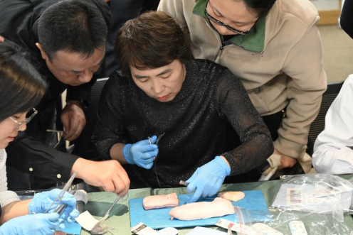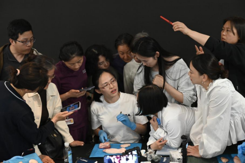 会议下半场,中国医学科学院整形外科医院医生周桂文进行了美容缝合实操演示。她利用猪肉模型,直观展示了精细创面缝合的技术要点,并指导与会医生进行分组模拟操作,使参会者在实践中进一步掌握美容缝合的关键技巧。