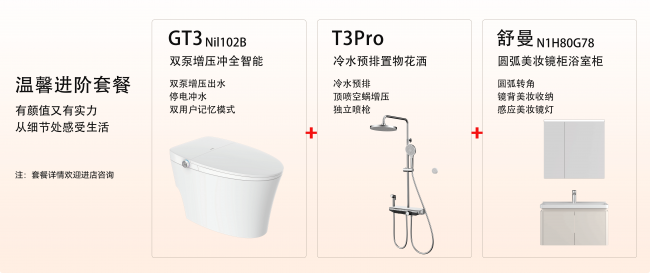 全智能马桶、置物花洒、标品浴室柜、淋浴屏风四大品类产品产品直补,回馈广大用户,更有消费满额升级权益,让用户享受大极具性价比的品质卫浴