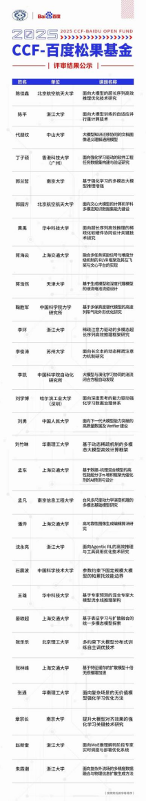 9月19日,2025年CCF-百度松果基金(以下简称“松果基金“)评审结果正式公布,29位来自高校及科研机构的青年学者获得松果基金。松果基金将以一年为期,为学者提供数百万课题经费,以及价值千万的平台、数据、技术等多维度支持,孵化AI科研创新成果。
