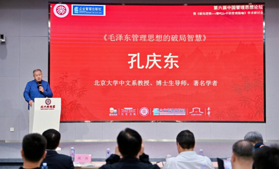 孔庆东以“毛泽东管理思想的破局智慧”为主题,阐释了“在秩序废墟上重写规则”的创新逻辑。指出《破局逻辑》中“合体共生”的思维,与中国共产党在革命与建设中整合资源的战略思维一脉相承。