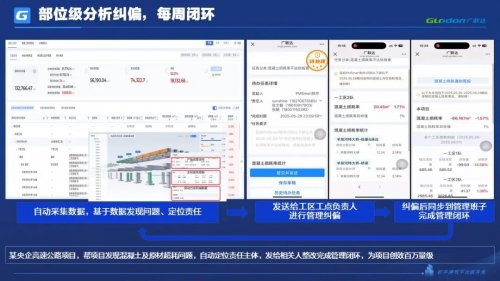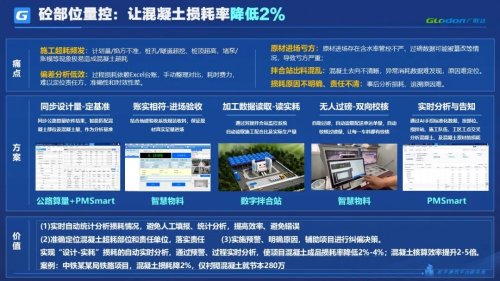 一是砼部位量控。借助公路算量、智慧物料、数字拌合站、PMSmart等专业工具,做到同步设计量定基准、原材料真实足量进场、自动读取施工配合比及实际生产量、无人过磅双向校核、实时分析与告知,实现“设计-实耗”损耗的自动实时分析和预警、过程实时分析,使项目混凝土成品损耗率降低2%~4%、混凝土核算效率提升2~5倍。同时通过AI赋能称重,实现材料验收环节精细化管理。