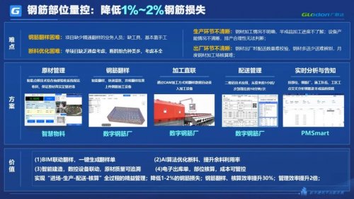 二是钢筋部位量控,智能化翻样下料,让钢筋利用率提高3%~5%。借助智慧物料、数字钢筋厂、PMSmart等专业工具,BIM联动翻样可一键生成翻样单;AI算法优化断料,提升余料利用率;智能建造数控设备联动,原材料质量可追溯;电子出库单部位核算,成本可控,真正实现“进场-生产-配送-核算”全过程精益管理,降低1%~2%的钢筋损失,钢筋翻样、核算效率提升30%,管理效率提升2倍。