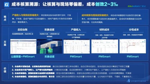 通过成本核算溯源,让核算与现场零偏差,成本创效2‰~3‰。借助公路算量、形象进度、PMSmart等专业工具,自动统计实际完成工程量,反馈更及时;自动套价计算产值收入,让产值与实际零偏差;自动匹配部位,按部位获取主材应耗与实耗数据,按部位跟踪分包总控量、收方量。