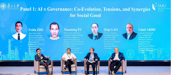 第一场圆桌讨论以“AI×治理:社会公益的共同进化、对立与协同作用”为主题,由朱飞达主持。与谈嘉宾包括傅晓明、复旦大学国际关系与公共事务学院教授高奇琦,以及Gilad ABIRI。