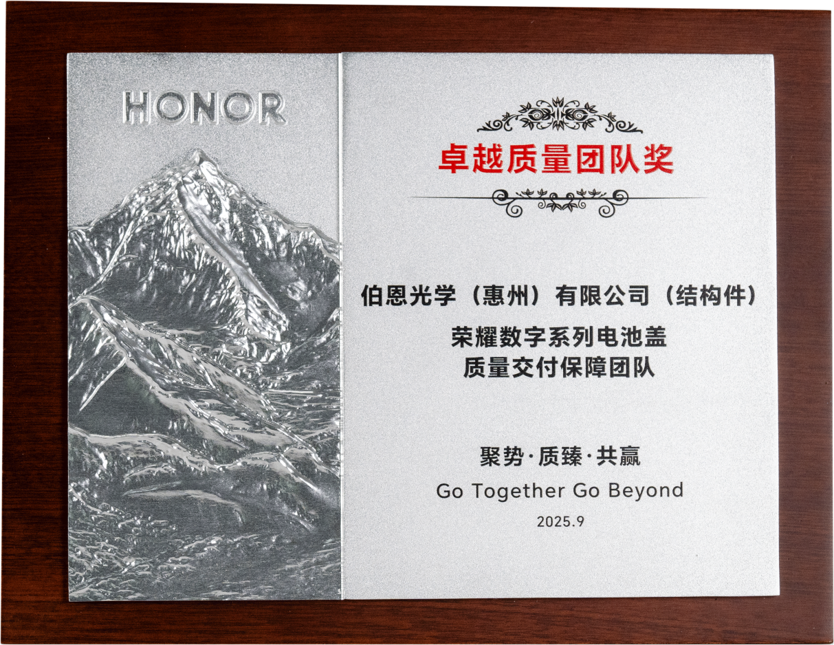 “卓越质量团队奖”是荣耀为表彰伯恩光学(主要为技术研发团队、BG团队)在荣耀数字系列手机中的卓越质量表现而颁发的。这是伯恩光学首次在荣耀年度供应商质量大会上斩获该奖项,标志着其质量管理体系获得荣耀认可。伯恩光学团队凭借严谨的工艺控制与持续优化,保障了荣耀数字系列产品的高品控标准。