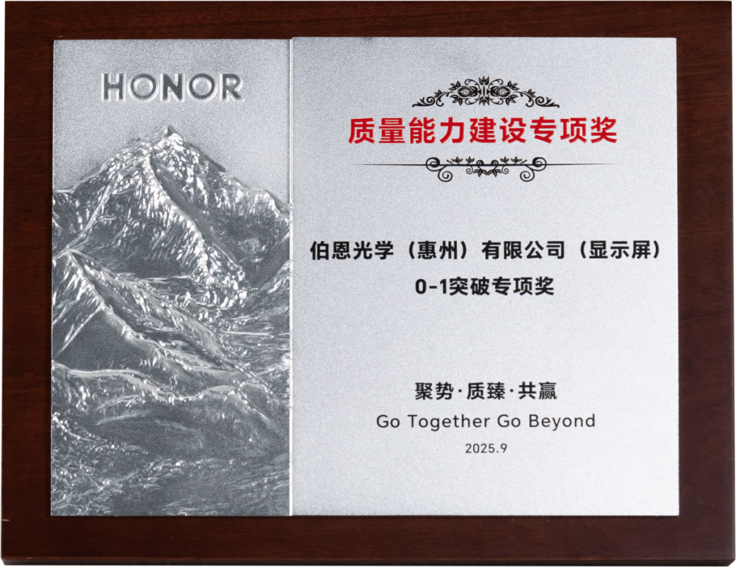 “质量能力建设专项奖”则是为表彰伯恩光学(前盖团队)与荣耀合作开发“魔女披风”新技术(该项目联合京东方BOE交付于荣耀)的优秀品质表现。